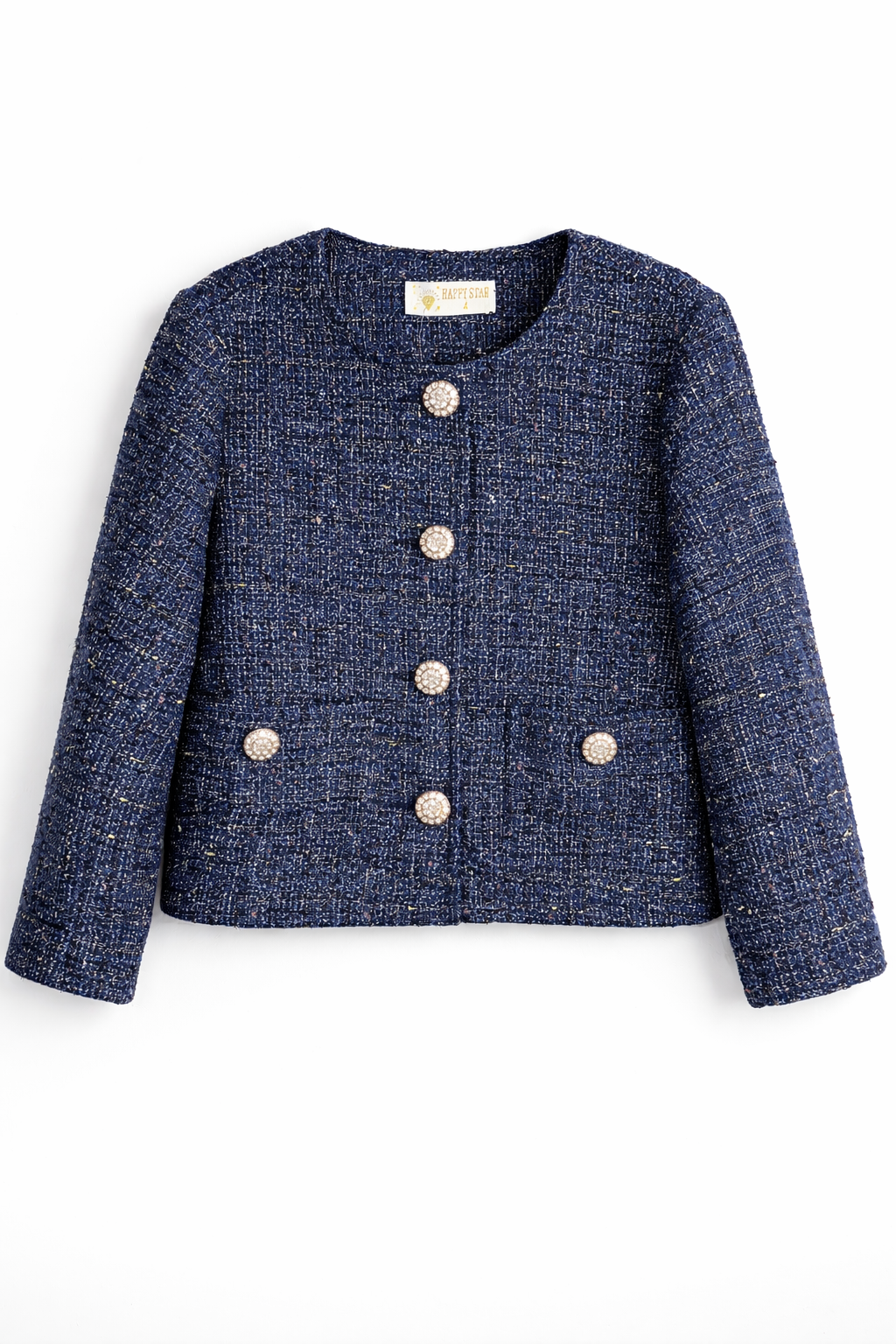 kort model met verfijnde tweedstructuur en elegante knoopdetails. Perfect voor een luxe en stijlvolle look.